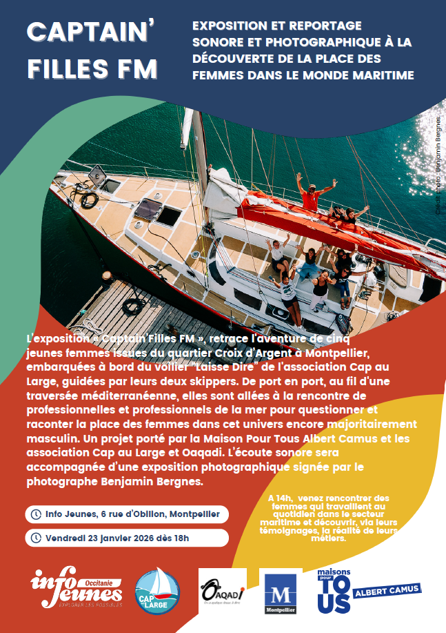 À partir de 18h, un vernissage sera proposé autour du reportage sonore « Captain’Filles FM », accompagné d’une exposition photographique de Benjamin Bergnes, retraçant le parcours de cinq jeunes femmes embarquées dans une traversée méditerranéenne à la rencontre du monde maritime. en partenariat avec la Maison pour Tous Albert Camus et les associations Cap au Large et Oaqadi.